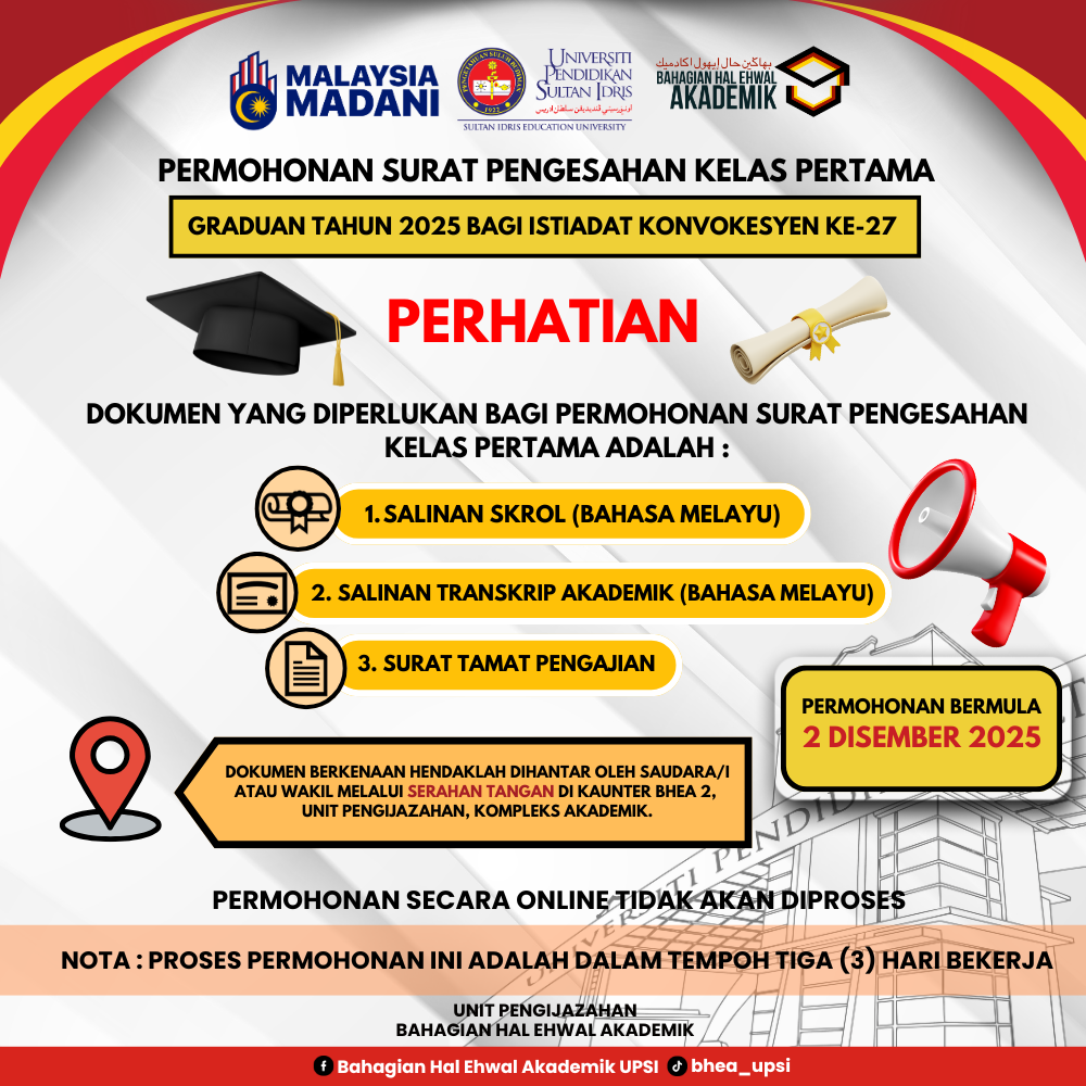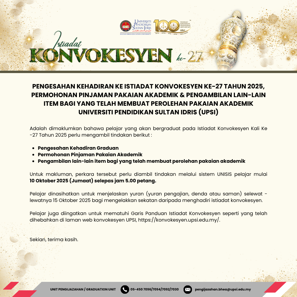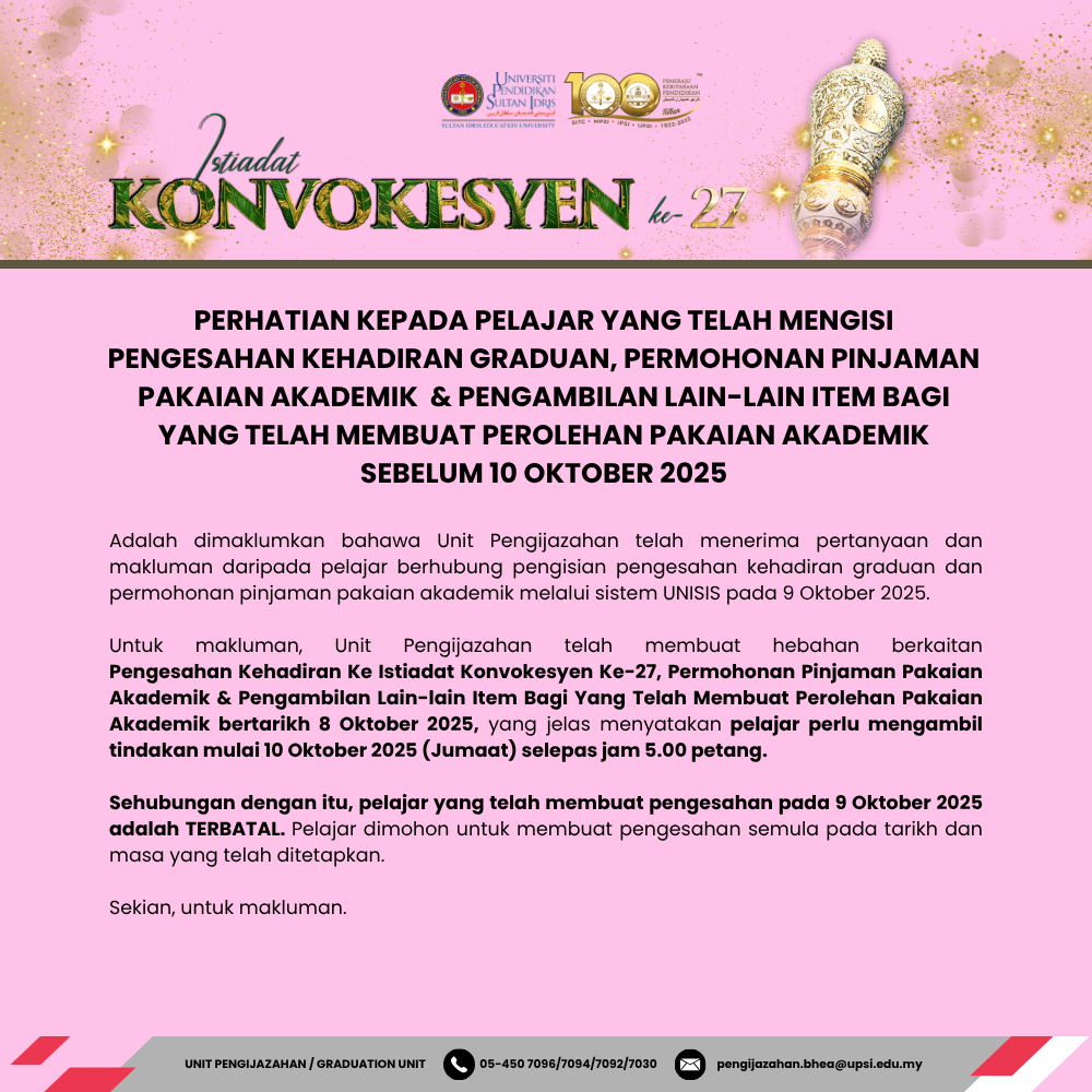 PEMAKLUMAN: ISTIADAT KONVOKESYEN KE-27 UPSI PADA 11 HINGGA 18 NOVEMBER 2025